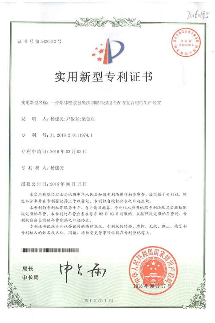 熱烈祝賀三門峽昊博化工工程有限公司又取得一項專利《一種熔體噴漿包裹法制取高強度全配方復合肥的生產(chǎn)裝置》,我公司本著化工裝備技術必須服從于化工工藝過程的需要,化工工藝過程與化工裝備技術達到完美和諧的統(tǒng)一的目標。 專心研發(fā)技術,實現(xiàn)技術、工藝過程和化工裝備的和諧統(tǒng)一,至今公司已取得近20項國家專利產(chǎn)品。